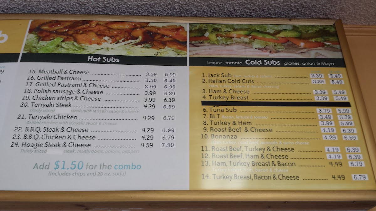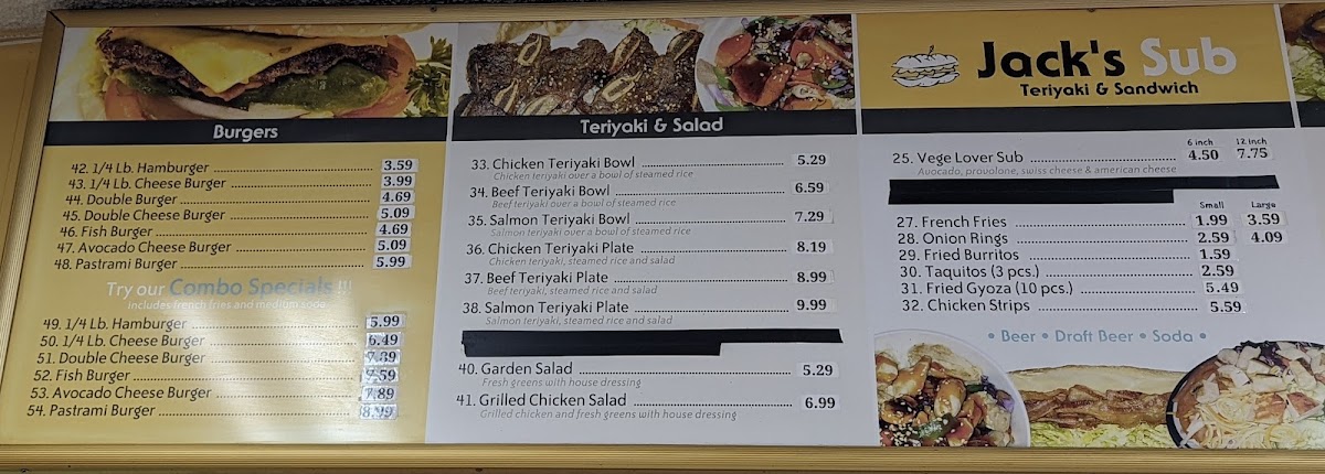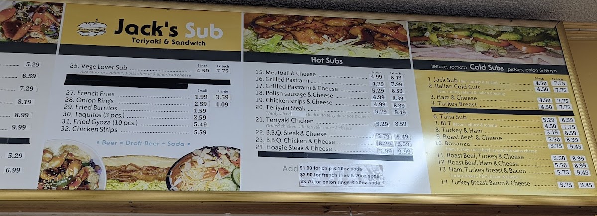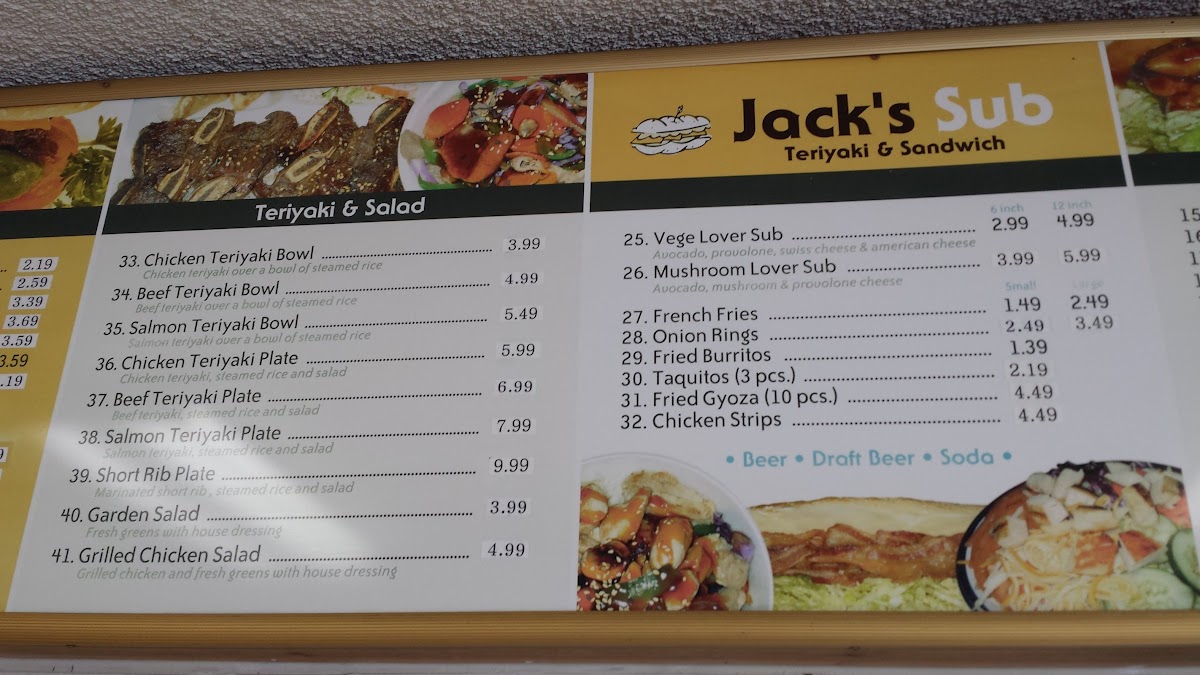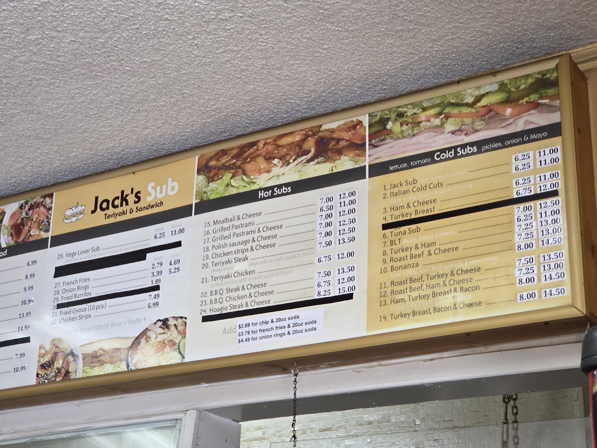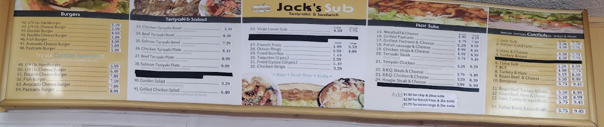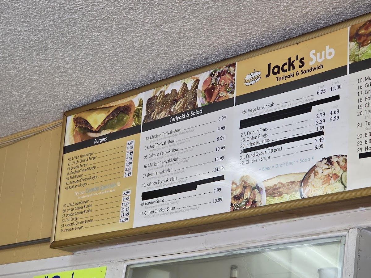 The menu at Jack's Sub offers a variety of sandwiches, burgers, and teriyaki dishes, catering to both quick meals and casual dining. The selection is structured into several main categories to help visitors easily navigate their options.